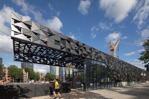MoederscheimMoonenArchitects 在鹿特丹歷史悠久的老港口區(qū)(Maritime District)設(shè)計(jì)了新的港口展館。建筑師們?cè)O(shè)計(jì)了一座新的緊湊型建筑,取代了曾經(jīng)位于其位置的三個(gè)過時(shí)的展館。展館增加了透明度和可見性,以便可以清楚地看到歷史悠久的港口和建筑物中發(fā)生的活動(dòng)。在新館內(nèi),多種功能匯聚一堂。展館內(nèi)設(shè)有鹿特丹港的港口參觀中心,游客可以在此了解這座城市令人印象深刻的海港。參觀者還會(huì)發(fā)現(xiàn)海事博物館(MaritimeMuseum)的工作坊。在這里,焊工、鐵匠和木匠在博物館港口維護(hù)歷史悠久的船隊(duì)。這些工作室向公眾開放,所有的室內(nèi)功能都是相連的,將歷史和現(xiàn)在的海港結(jié)合在一起。參觀者可以直接穿過港口參觀中心進(jìn)入海事博物館的車間! 此外,建筑物兩端有餐廳,咖啡廳的空間。