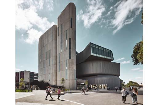 由伍茲貝格設(shè)計(jì)的澳大利亞迪肯大學(xué)法學(xué)院大樓如雕塑般伏臥在校園的一角,協(xié)調(diào)著這所大學(xué)位于墨爾本、如碎片般分裂的伯伍德校區(qū)。該建筑打造了通往埃爾加路區(qū)(Elgar Road Precinct)的“燈塔”和門戶,以此為整個(gè)城市、校園構(gòu)筑了定位地標(biāo)和尋路點(diǎn),并增強(qiáng)了校園整體的空間體驗(yàn)。迪肯大學(xué)法學(xué)院大樓有著引人矚目的幾何形體,其設(shè)計(jì)靈感來源于內(nèi)部學(xué)習(xí)空間的創(chuàng)新融合,并且其中每個(gè)空間的設(shè)計(jì)都開始于對(duì)不同新興教學(xué)方法的詮釋,也因此,大樓內(nèi)的講堂擯棄了傳統(tǒng)的設(shè)計(jì)方式。
